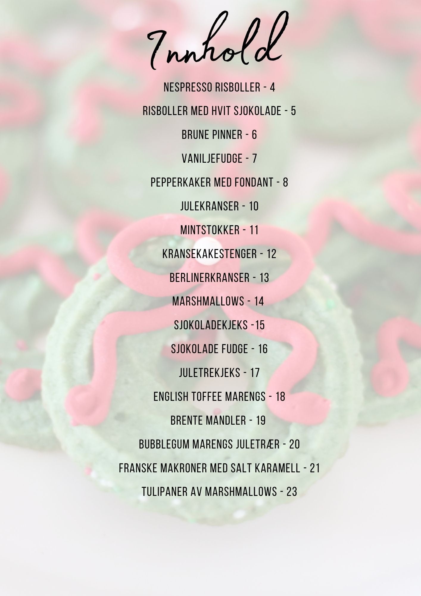 Innholdet spenner fra tradisjoner som brune pinner, berlinerkranser, julekranser og sjokoladekjeks, til moderne julefavoritter som pepperkaker med fondant, juletrekjeks, English Toffee-marengs og Bubblegum marengs-juletrær – en sikker hit både på kakebordet og i sosiale medier.